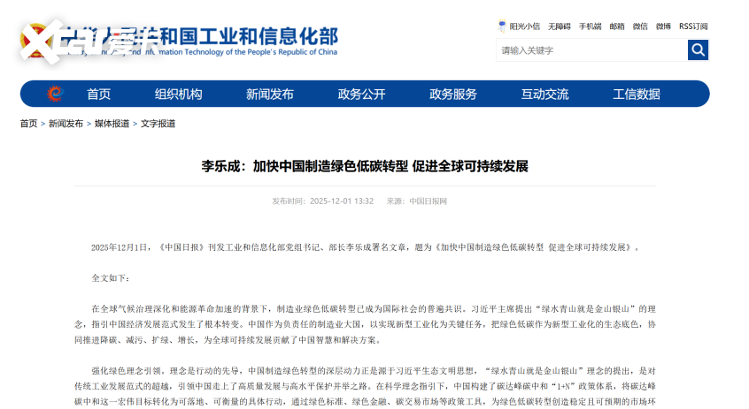 12月1日,《中国日报》刊发工业与信息化部党组书记、部长李乐成署名文章,题为《加快中国制造绿色低碳转型 促进全球可持续发展》,明白准确地提出加强绿色产业国际合作的核心方向。文章指出,中国制造将秉持共商共建原则,依托双边和多边国际合作机制,深化绿色技术、装备、贸易、标准等领域的交流合作。其中,新能源汽车与光伏、风电、锂电池一同被列为中国优势产业,工信部明确鼓励这些领域的企业“走出去”,在“一带一路”沿线国家投资建设绿色能源项目,推广绿色基础设施和交通解决方案。