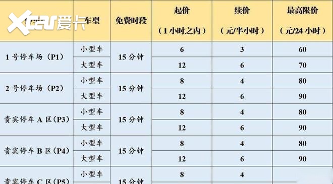 大型车:15分钟内免费,1小时内12元,之后6元/半小时,90元/24小时;